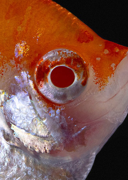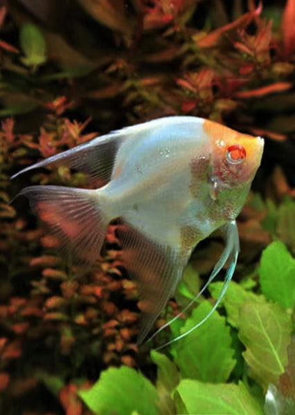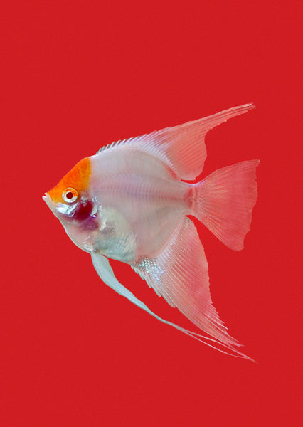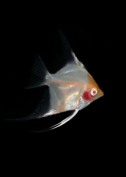 The Albino Red Cap angelfish is a rare and attractive platinum angel with red eyes and a golden patch on the forehead that deepens in color with age, turning more red as the fish matures. . Note: The orange patch may appear yellow in younger fish or in larger fish after transport.