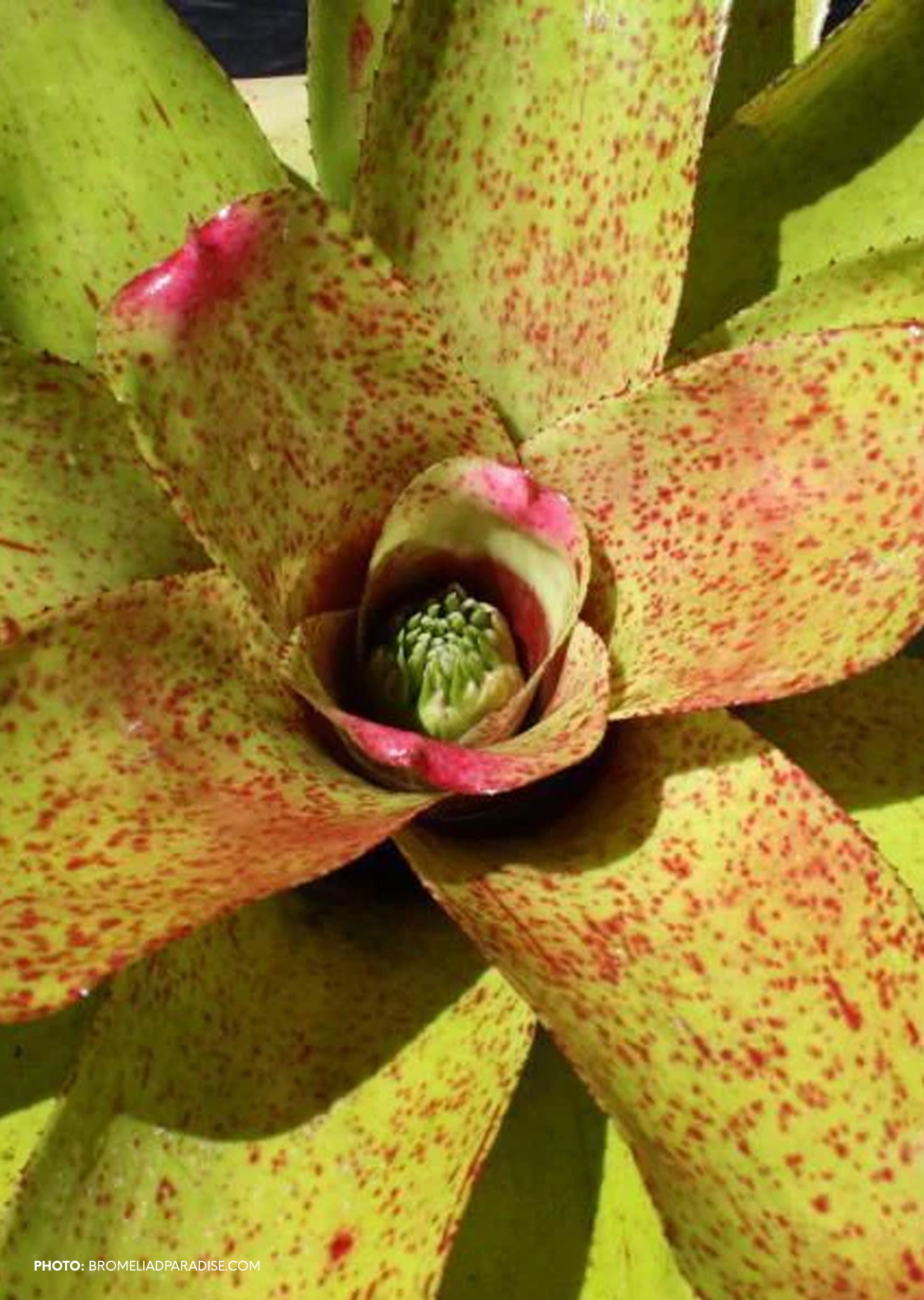 Neoregelia ‘Carol Johnson’ is a sporty hybrid (johannis × ‘Angel Face’) known for its striking foliage. When grown under sufficient bright, filtered light, the leaves develop a light yellow-green base with fine red speckling and red-tinged tips. At maturity, the rosette is broad and decorative, with leaves that can be nearly three inches wide in vigorous specimens.