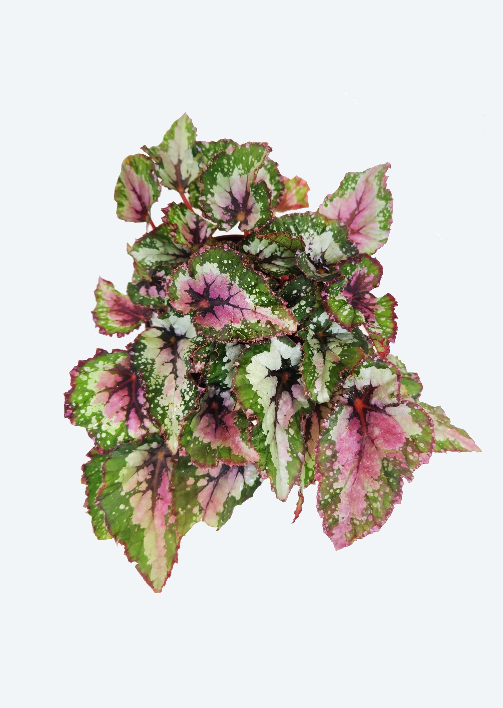 Begonia Rex ‘Purple Blush’ (Rex Begonia hybrid) is a cultivated foliage variety valued for its ornamental leaves and compact growth habit. Like other Rex Begonias, it forms a low-growing mound of textured, asymmetrical leaves with pronounced veining. ‘Purple Blush’ features deep purple tones blended with silvery highlights and darker margins, creating strong contrast in shaded displays. Mature plants typically remain compact rather than tall, spreading gradually through short rhizomatous growth. While primarily grown for foliage, Rex Begonias may produce small, delicate flowers under stable conditions, though the leaves remain the main ornamental feature. Best grown in well-drained, lightly moist substrate with good airflow and moderate to high humidity.