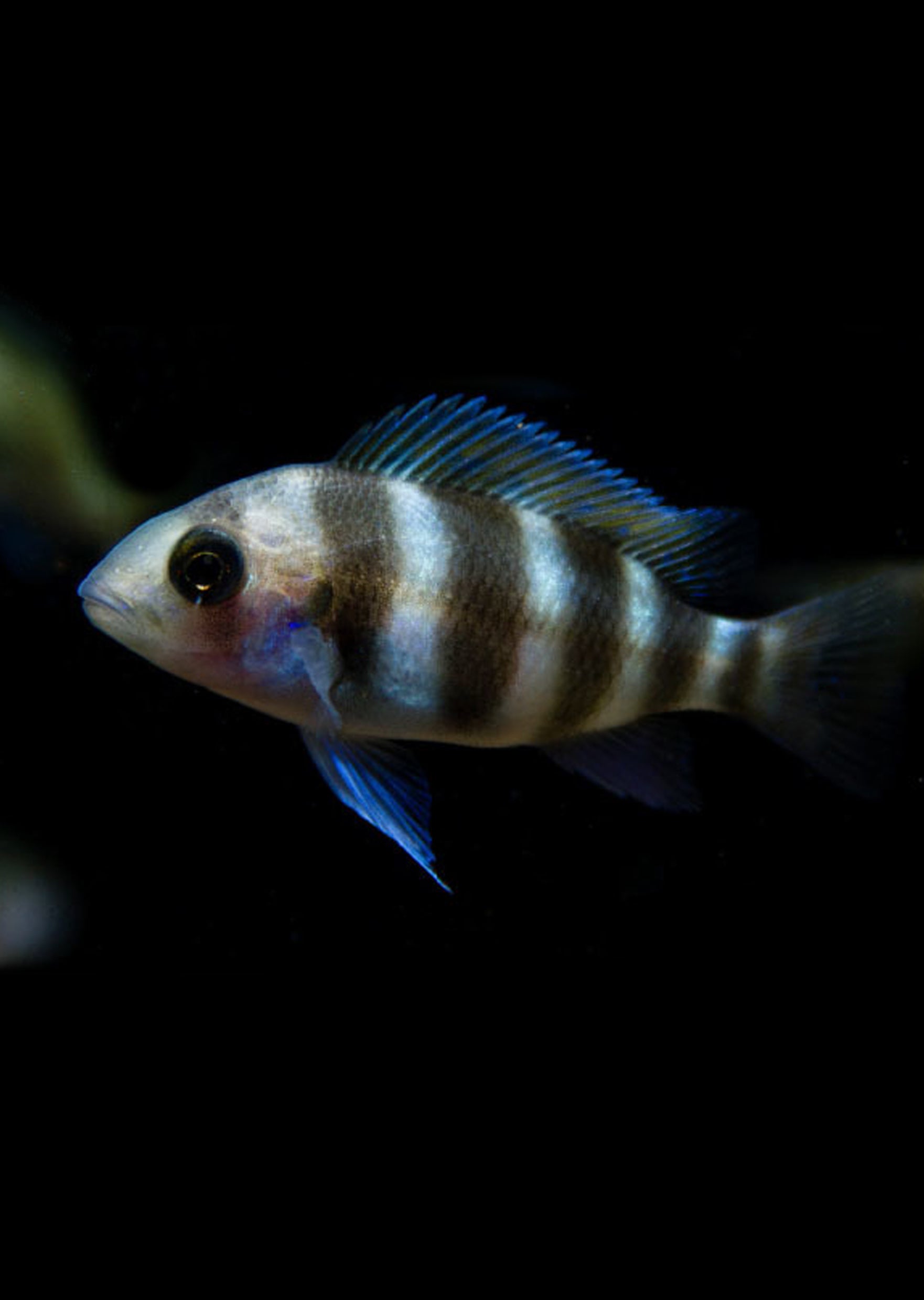 Young juvenile stock of Frontosa Blue Mpimbwe (Cyphotilapia gibberosa Mpimbwe), a highly regarded Tanzanian locality known for developing deep blue body tones and bold markings as adults. At the juvenile stage, coloration is subtle and not yet representative of adult appearance. The intensity of the future blue depends greatly on water stability, low stress, high-quality diet, lighting, and long-term environmental conditions.