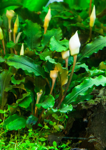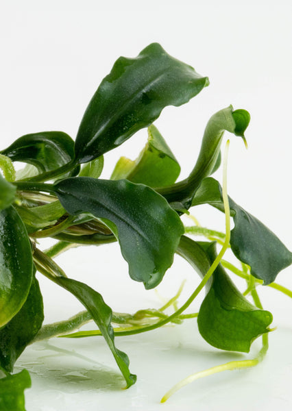 The green leaves are 2 cm wide and 5 cm long with wavy edges. Tiny white spots will appear on immerse leaves. The creeping stem, rhizome, must not be covered when planting. This will cause the plant to rot and die.