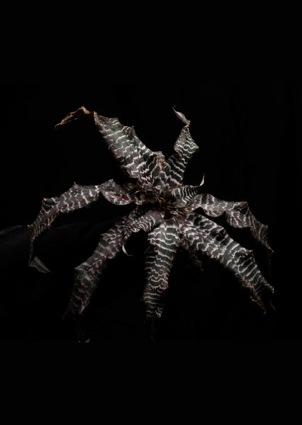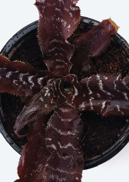 Cryptanthus ‘Black Mystic’ is a terrestrial Earth Star bromeliad valued for its dark, dramatic foliage and pronounced zebra-like banding. The elongated leaves display deep chocolate to near-black base tones overlaid with contrasting silvery transverse markings. Serrated and slightly undulating leaf margins enhance its bold texture. Under strong indirect light, contrast between the dark base and lighter banding becomes more defined. As with many Cryptanthus hybrids, coloration intensity varies depending on light strength, humidity, and plant maturity. The plant forms a spreading rosette and produces offsets over time, often developing into striking clustered displays.