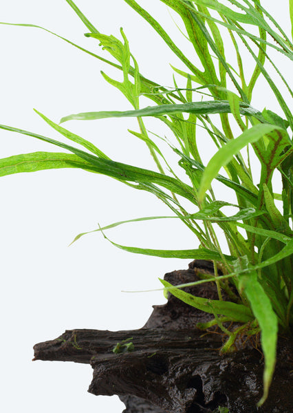 Microsorum pteropus 'Trident' grown on wood. Green, narrow-leaved, smaller form of Microsorum (java fern), which like other Microsorum is an easy and safe plant. ’Trident’ is both suitable for beginners, as well as the experienced scaper, and fits both smaller and larger aquariums. The name ’Trident’ tells that the plant leafs are tripartite, while the leaves can vary from whole to multipartite. Suitable for planting on stones or tree roots. When planted on the bottom layer, avoid covering the horizontal stalk. New, small plants are often created on the leaf tips, and can carefully be pulled off and planted.
