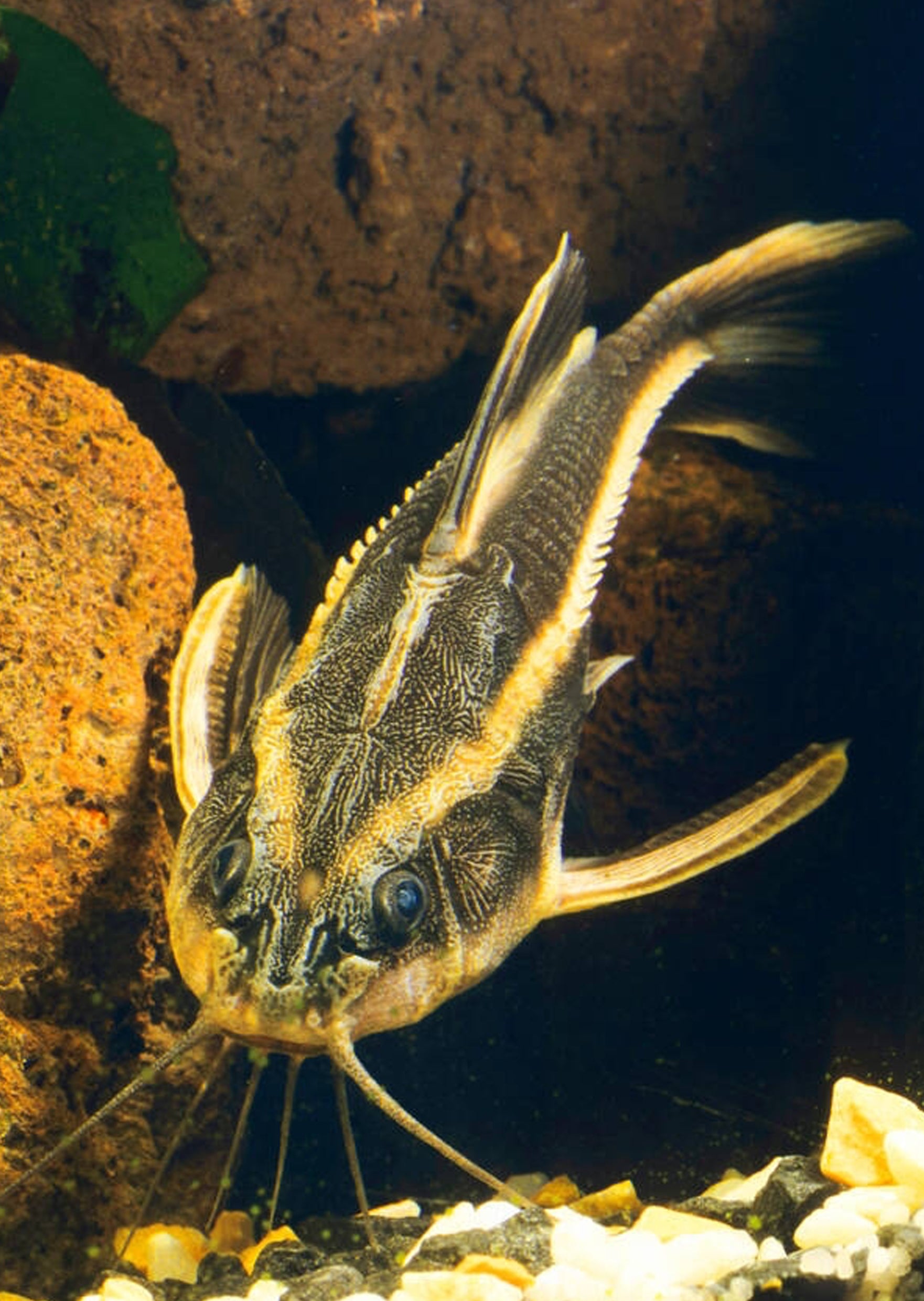 Young juvenile stock. Also known as the Talking Catfish, Striped Dora Catfish, Raphael Catfish, or Chocolate Catfish, this armored species is a classic favorite among aquarists. With its bold cream-colored stripes against a dark brown body, it adds both beauty and character to community aquariums. Platydoras costatus is famous for producing audible “clicking” or “talking” sounds when handled or during social interactions. Peaceful and hardy, it thrives as a bottom-dweller and is best kept in a group where it feels secure. Our stock is sold as juveniles, giving hobbyists the joy of raising them to full size.