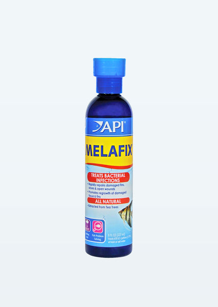 API MELAFIX fish remedy is an all-natural antibacterial treatment that works to treat infections in fish. Common bacterial infections are open wounds and abrasions, tail rot, eye cloud, and mouth fungus. MELAFIX fish remedy also promotes regrowth of damaged fins and tissue. Product may be used when adding fish to an aquarium – particularly to smooth the transition from store to home – and if an infection is suspected, but not yet diagnosed. Some fish bought in pet stores are already carrying diseases at the time of purchase, which may be difficult to detect in its early stages. API MELAFIX fish remedy will not adversely affect the biological filter, alter the pH, or discolor water.