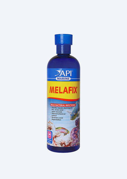 API MARINE MELAFIX fish remedy is a safe, natural fish remedy which should be used to treat bacterial infections in saltwater fish and corals. MARINE MELAFIX fish remedy contains Melaleuca (tea tree) extract to soothe and calm your fish, and rapidly repairs various fish ailments, from open sores to pop eye. It also reverses coral degradation. API MARINE MELAFIX fish remedy will not harm the biological filter in your aquarium, and may be used in all marine and reef aquariums.