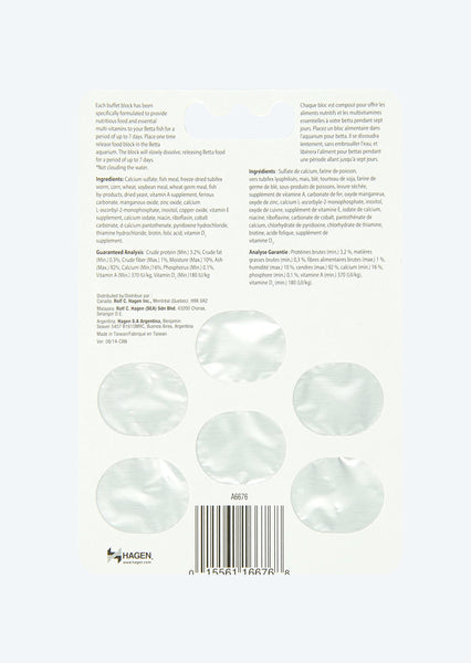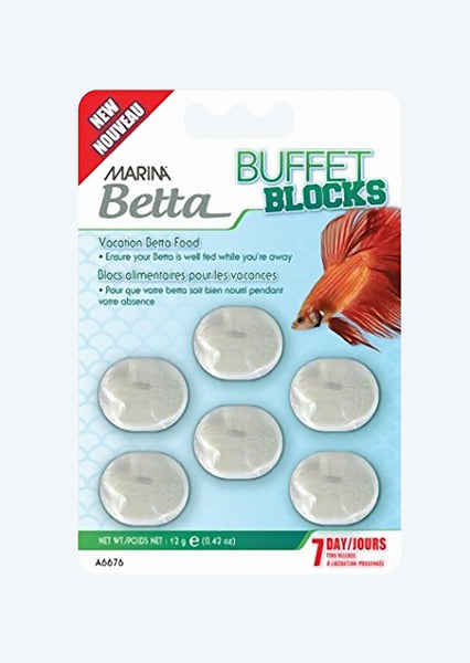The Marina Betta Buffet blocks are the ideal vacation food. No need to worry about your Betta if you go away. The buffet block will slowly release all essential multi-vitamins and nutrients over a period of 7 days and this without clouding the water.