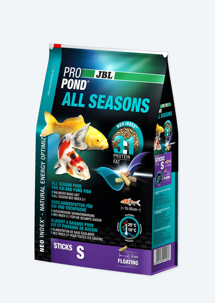 - Floating sticks with 24 % protein, 7 % fat, 4 % crude fibre and 8 % crude ash