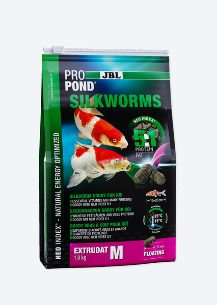 - Floating food in silkworm shape and ideal composition with 44% protein, 9% fat, 2% crude fibre and 10% crude ash.