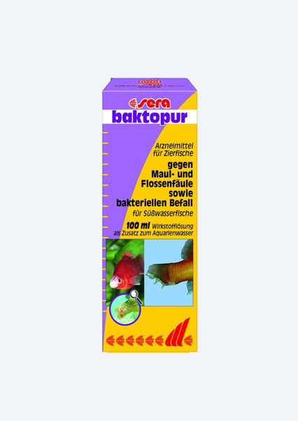 sera Baktopur (Bactopur) liquid. Water conditioner for use in freshwater in case of typical bacterial disease such as Columnaris disease, fin rot, gill rot as well as infections by Aeromonas or Pseudomonas bacteria.
