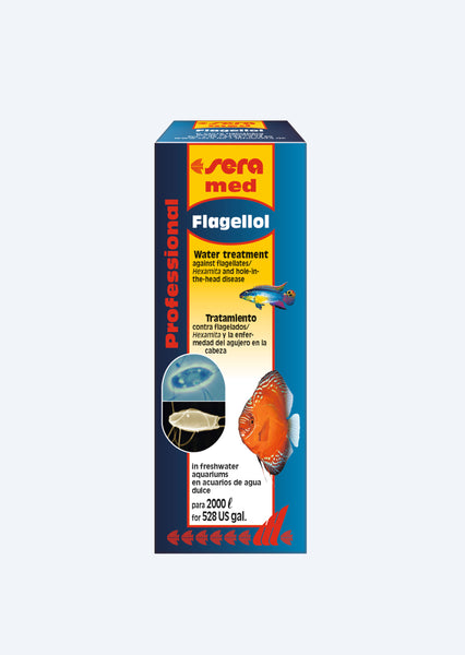 Water conditioner for the effective and gentle removal of intestinal flagellates (e.g. Hexamita sp., Spironucleus sp. – pathogens causing hole-in-the-head disease) and other single celled intestinal parasites. sera med Professional Flagellol is also effective against the pathogen that causes velvet disease (Piscinoodinium pillulare).