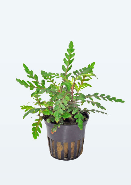 Hygrophila pinnatifida originates from India. It obtains brown, patched leaves on the surface with a distinctive burgundy colour underneath. It creates horizontal side shoots and the top shoots should be pinched out in order to maintain compact and attractive growth. The horizontal side shoots easily attach to both wood and rocks. Growth is moderate, stems 15-40 cm tall and 10-20 cm wide, and the colour is attractive when planted in small groups with a plain background. Intense lighting ensures compact growth due to the plant's slow to medium growth rate.