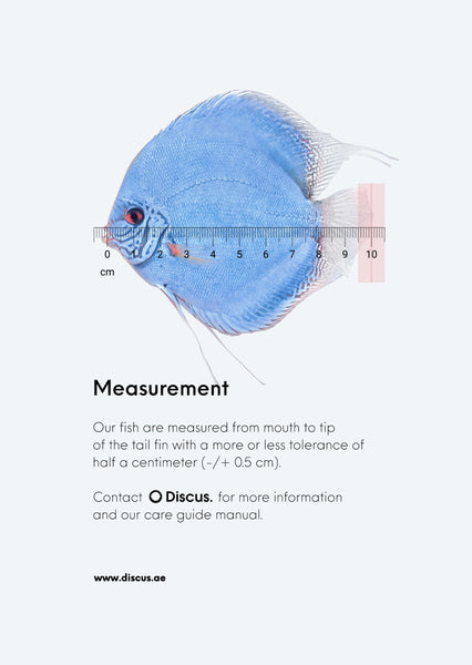 All our discus fish are measured in centimeters (not inches) with a variation tolerance of half a centimeter in length (-/+ 0.5 cm). Be sure to check our measuring image and use the conversion table below for your reference.