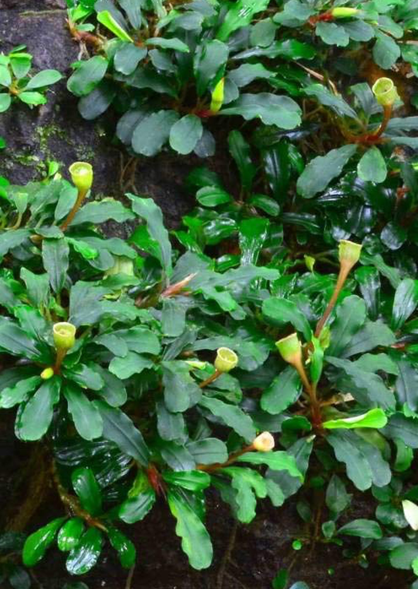 Bunched plants are young stems held with small anchors or coconut fibre. They may have few or no roots, which develop soon after planting. Most are supplied in emersed form, old leaves may melt as new underwater growth appears.