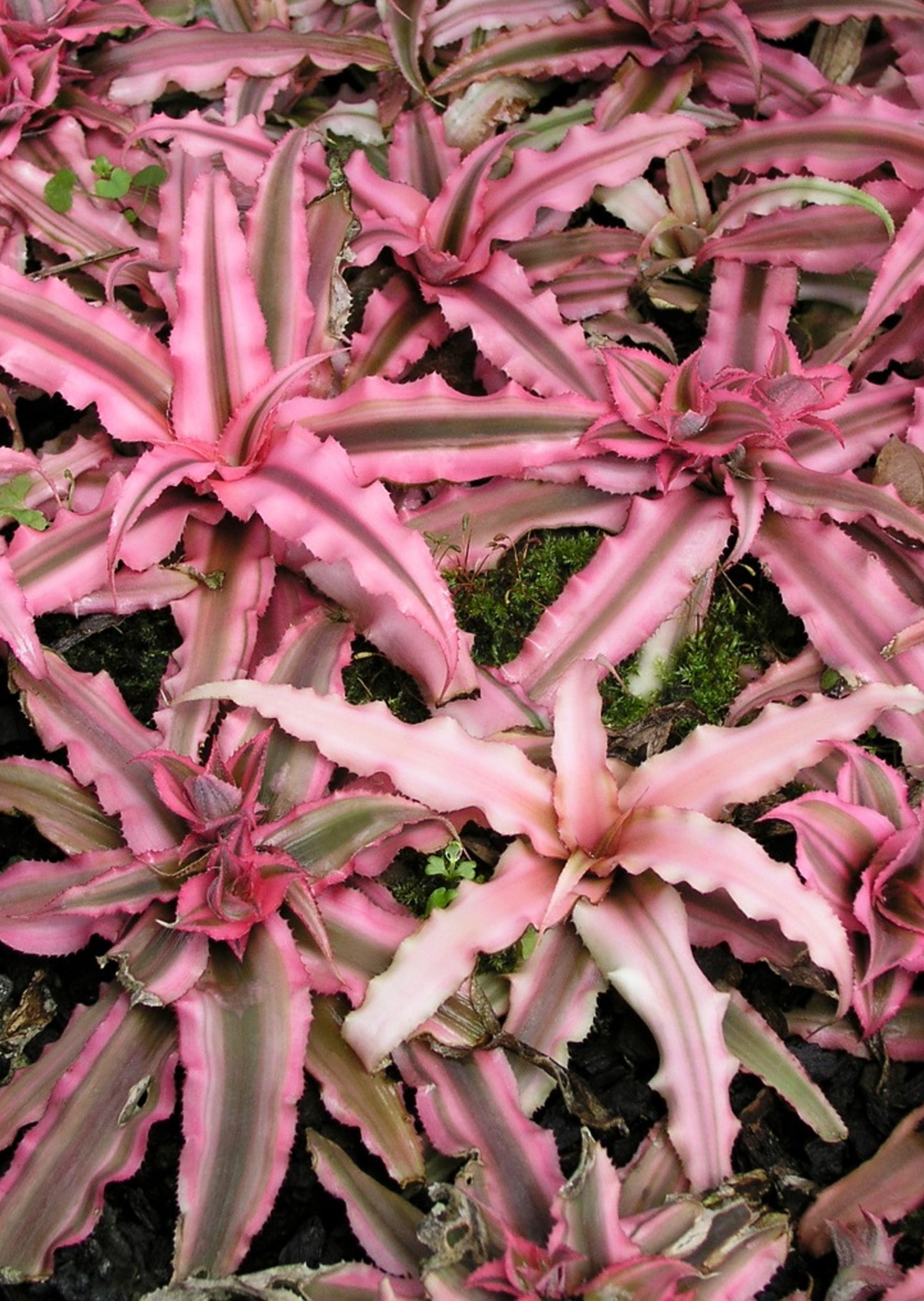Cryptanthus ‘Pink Starlite’ is a terrestrial Earth Star bromeliad recognized for its vivid pink margins and contrasting banded foliage. Leaves display bright pink outer edges with olive to bronze mid-tones and lighter central striping, creating a star-like rosette appearance. Fine serrated leaf margins add texture and definition to the plant. Color intensity varies depending on light strength, humidity, and maturity, with brighter indirect light typically enhancing pink tones. The plant forms a low-growing rosette and produces offsets over time, often developing into compact clusters suitable for terrarium installations and tropical plant displays.